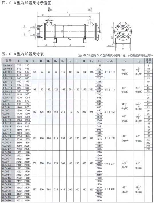 注:GLCA型與GLC型外形尺寸相同,油、水口有螺紋和法蘭兩種冷卻器